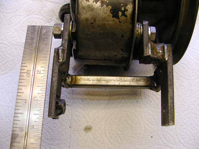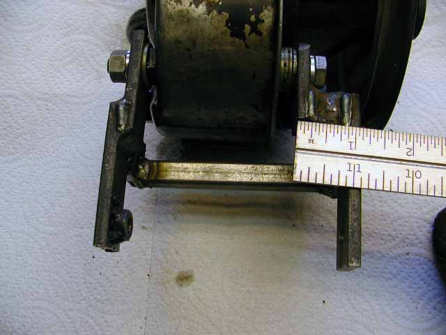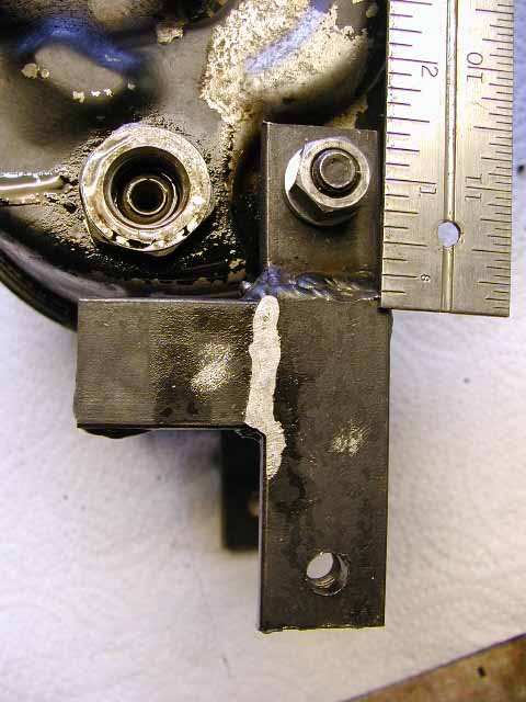 1/4" x 1" flat bar was used for most of the mount. The brace between the legs was made of 1/2" square tubing. Washers were used to get exact spacing of legs from pump body so that the pulleys lined up for the belt. Many tack-welded test fits were done before the mount was able to be fully welded into its final configuration. We didn't bother to paint the mount because by the time it was assembled onto the pump it was already well oiled. The studs/threaded holes in the pump body are 3/8".